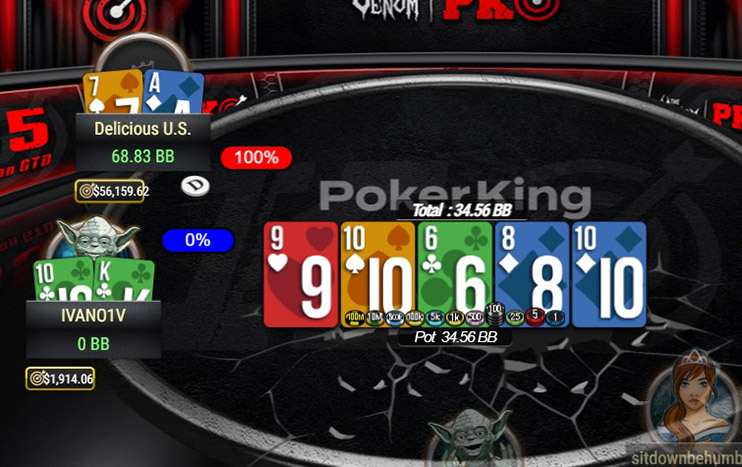 Даже в итоговой раздаче турнира по шансам должен был побеждать соперник «Sitdownbehumble» с A8, а не QK нашего героя, но на терне пришла дама.